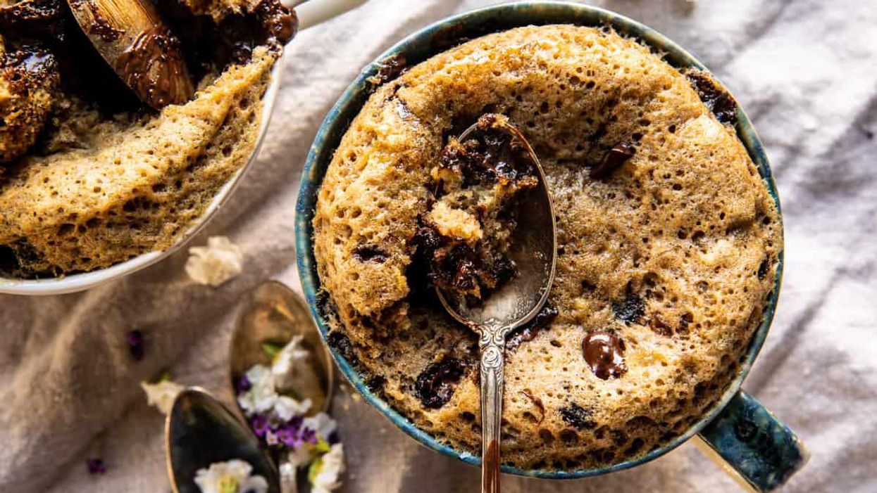 First, chocolate chunks…and a generous helping too. The chunks are a must and create the most luscious banana mug cake. You will fold them into the batter as the final ingredient. As the cake bakes, the chocolate sinks in, melting as it sinks. It leaves you with a puddle of warm melted chocolate throughout your cake. And with every bite, a little of that melted chocolate is scooped up.