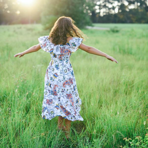If you usually shy away from bold color, know that a floral pattern can soften up the look—this raspberry red dress will be easier to pull off with confidence than you think.