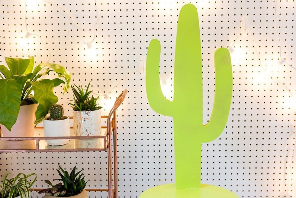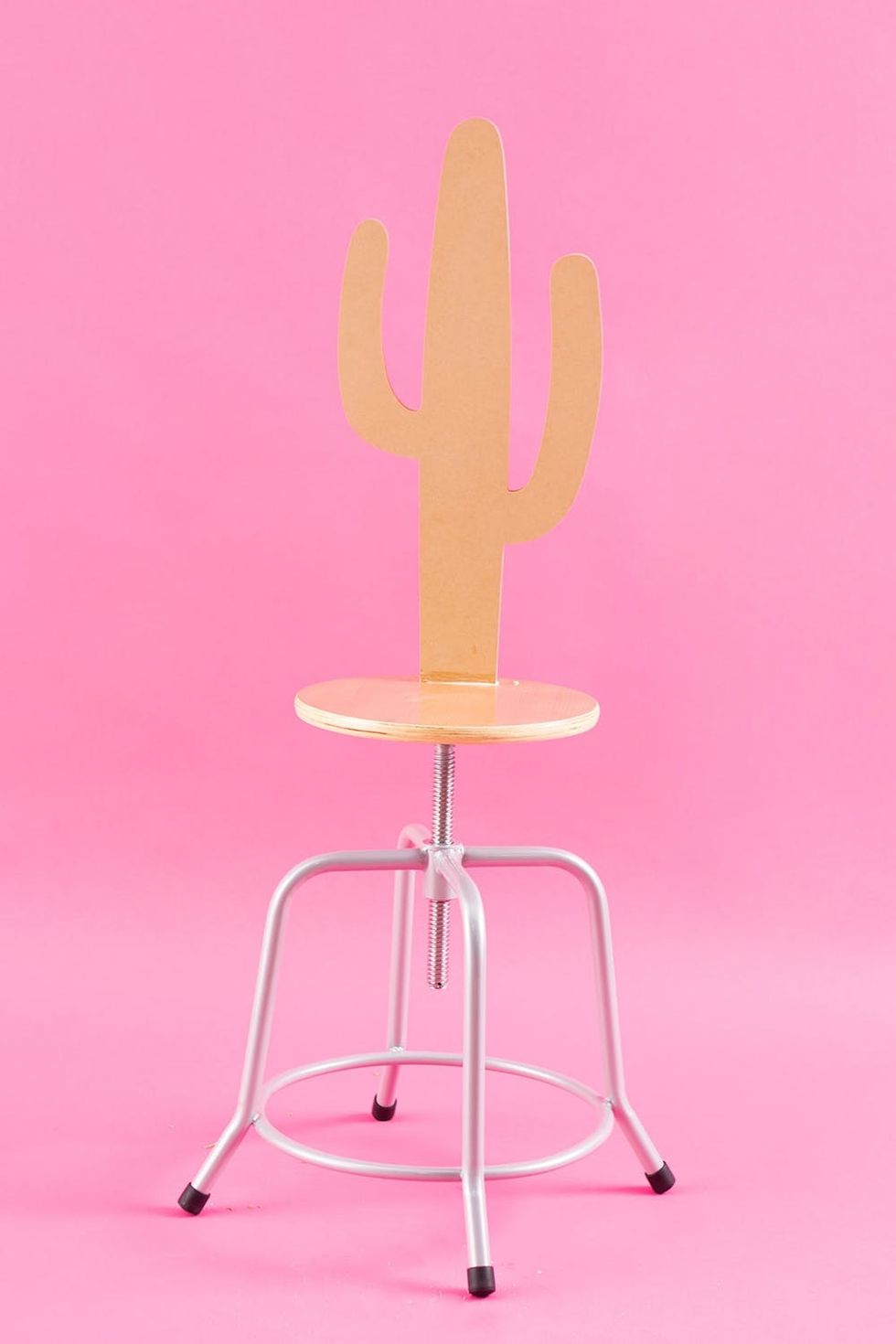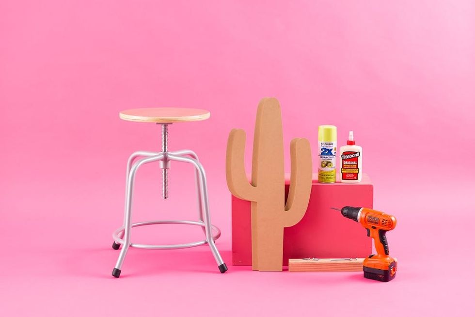 One of my favorite parts of my job is when my coworkers challenge me to make something. This time around it was Alonna, who challenged me to make this awesome cactus chair she saw on Pinterest. I brainstormed ways to create the wire backing, but everything seemed to be too difficult or time consuming, and required lots of labor. I then stumbled upon a bunny stool tutorial and realized — hey, why not do this with a cactus cutout! Lo and behold, my version of a cactus chair! Follow along below to learn how to create your own in a few easy steps.