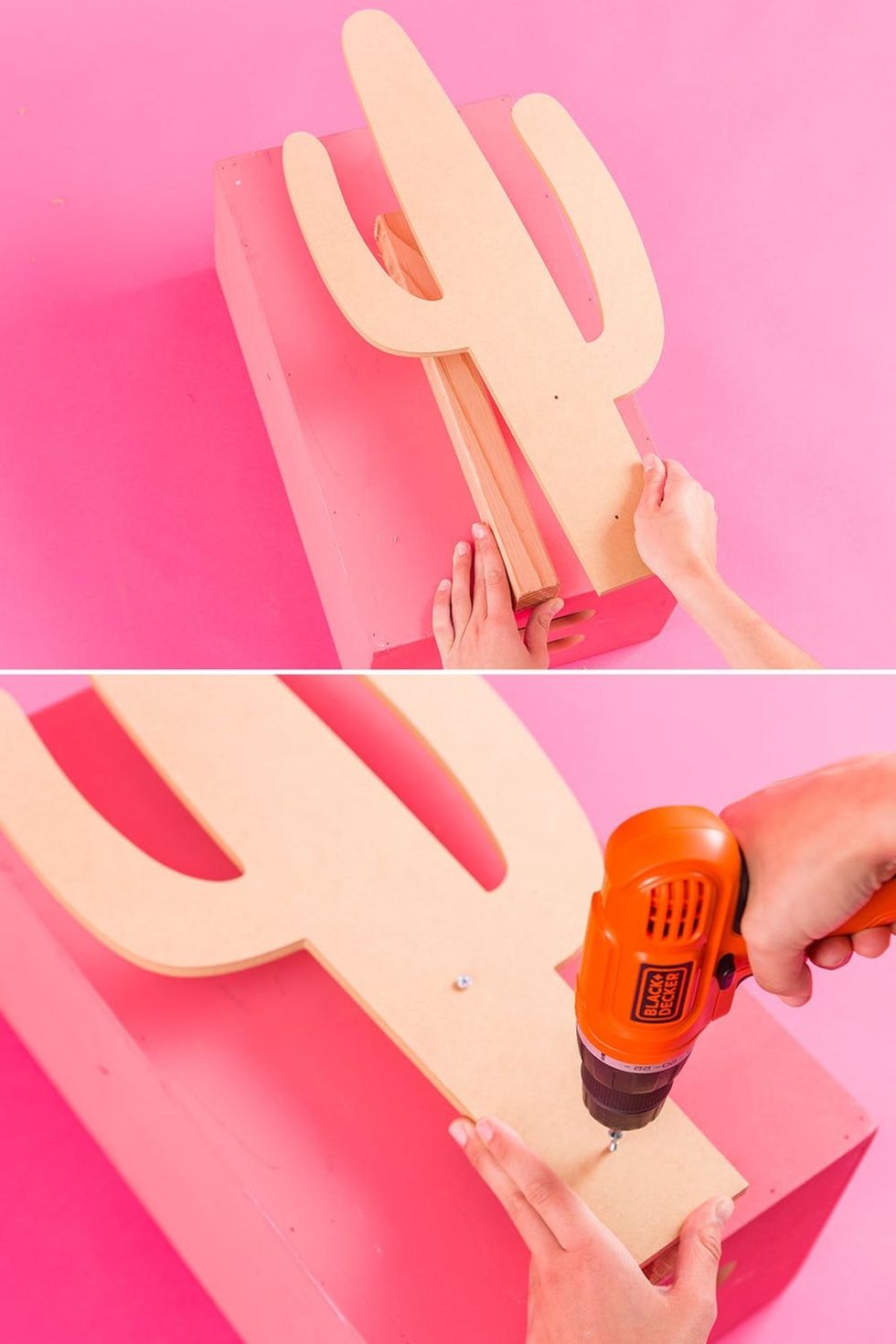 - Place the 2×2 behind the cactus and drill the pieces together using the 1-inch wood screws.