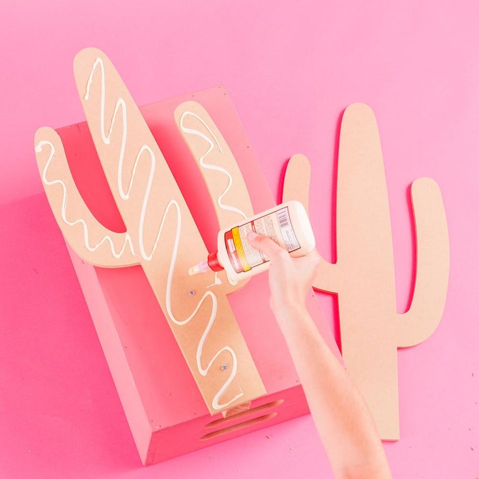 Use wood glue to attach the second cactus cutout on top of the drilled cactus cutout.