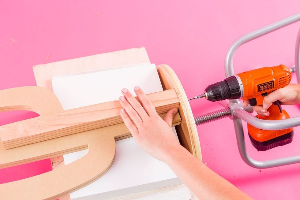 Transfer the tape to the edge of the stool and drill holes in place of the taped holes.