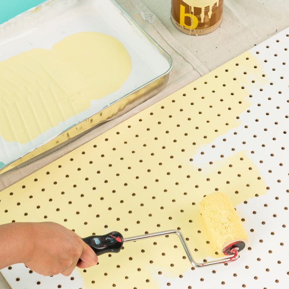 Add about 1/2 cup of the second paint into the tray to mix your next color. Repeat this until you’ve finished painting the entire pegboard.