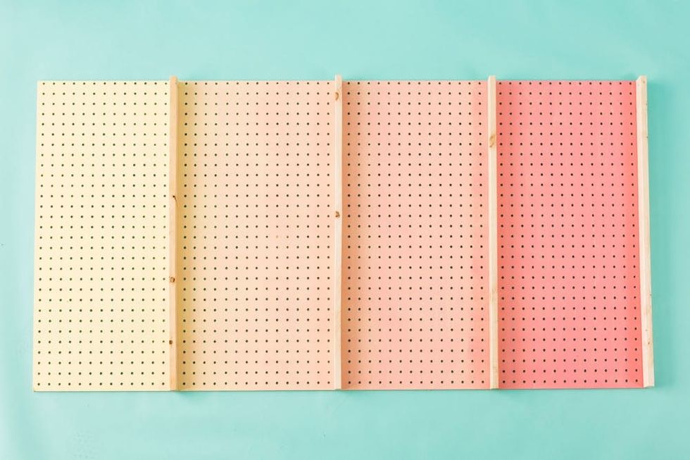 To achieve an ombre effect, start with one color on one end of the pegboard — this will be the base for the rest of the colors. Pour more paint into your tray than you anticipate using; I painted about 14 inches for each block of color.