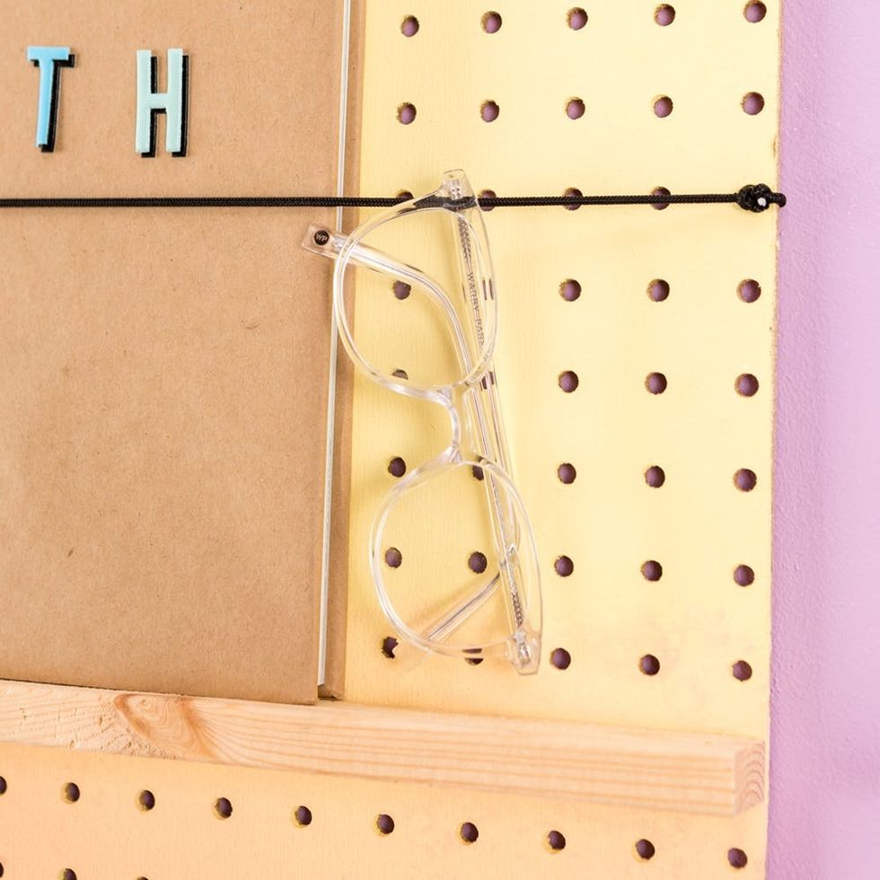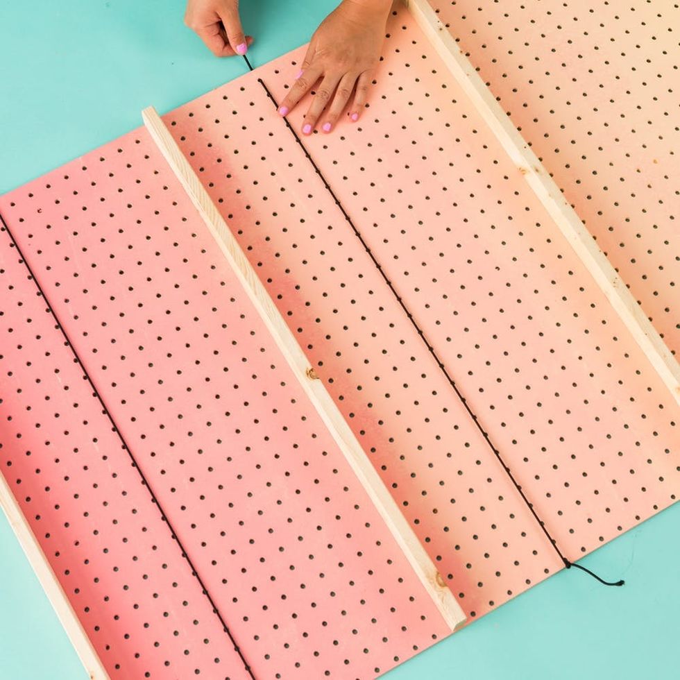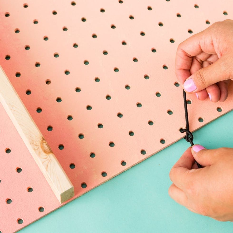 Cut a 24-inch piece of elastic cord and knot it around one end of the pegboard.