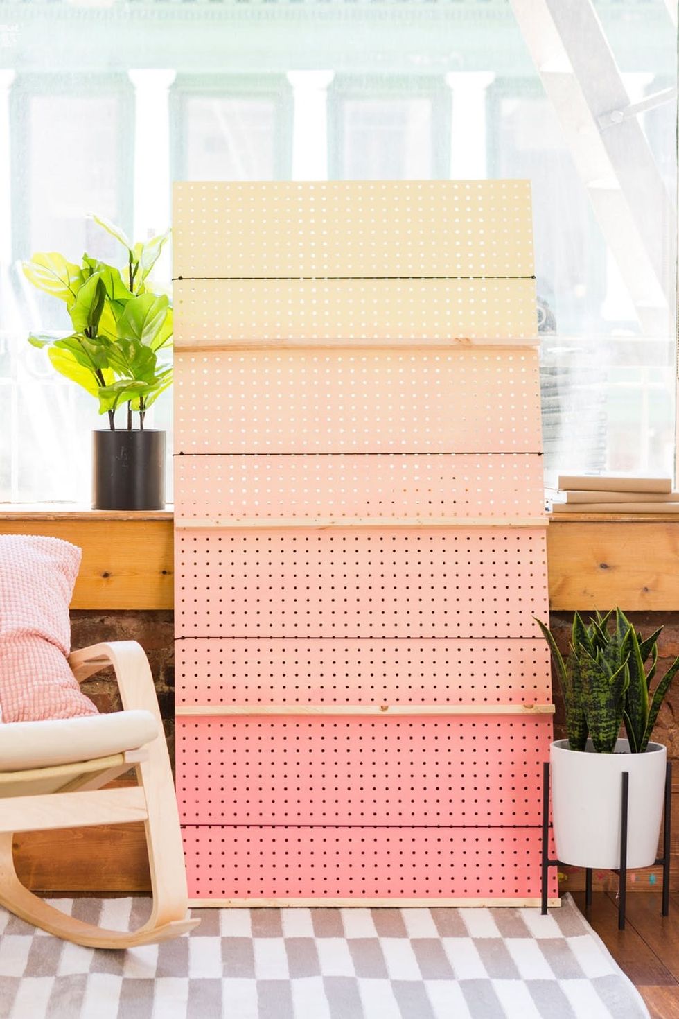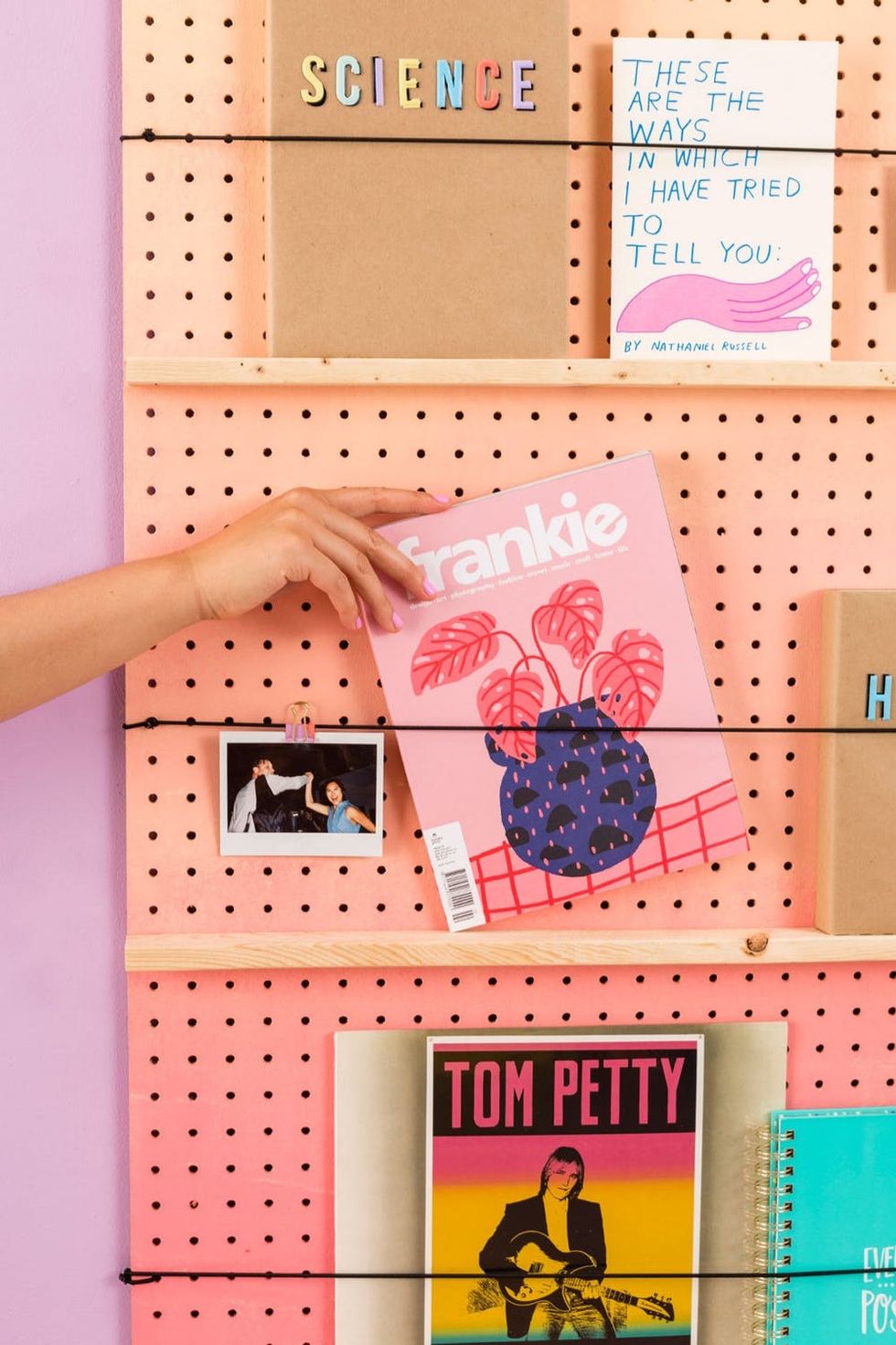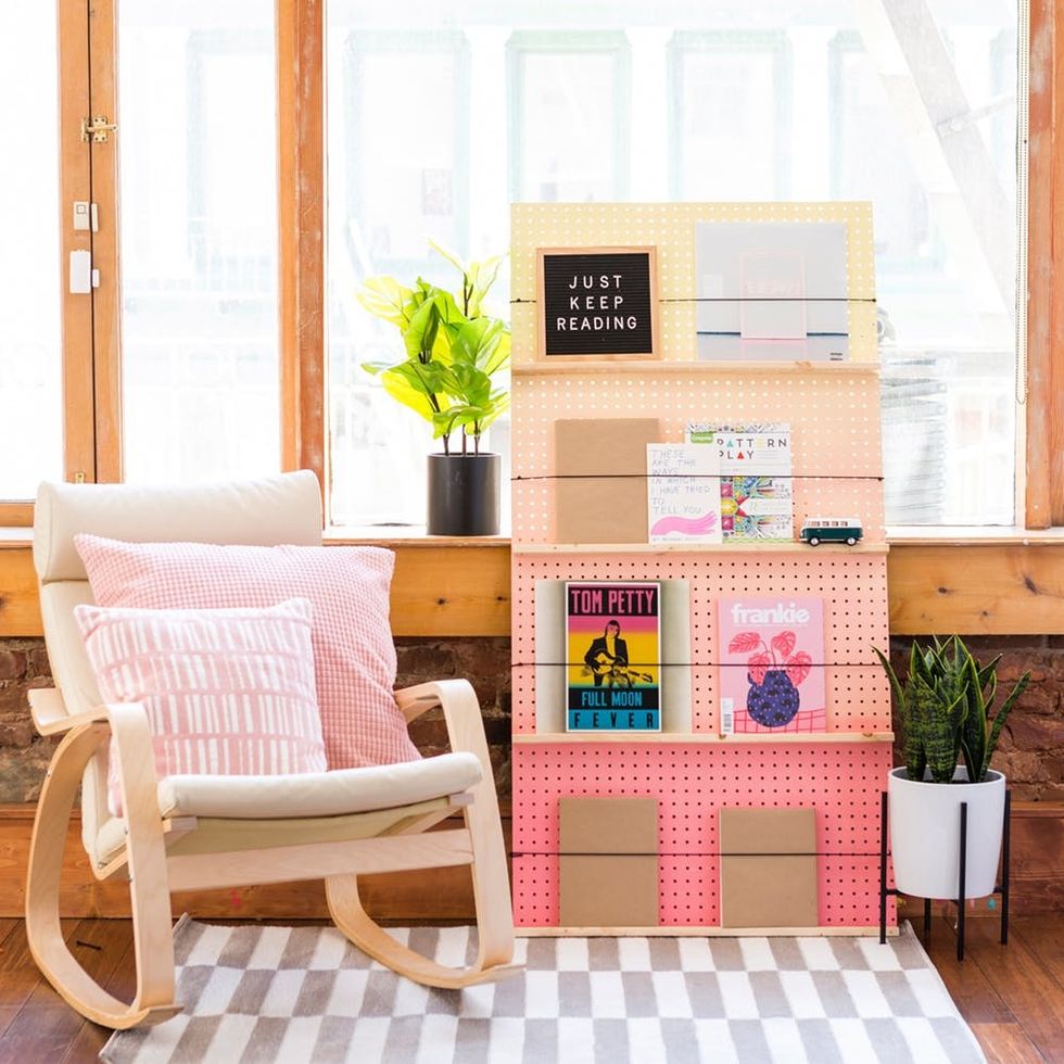 As a big-city renter pressed for space, I’m constantly on the lookout for low-profile shelving solutions that won’t damage my walls. I also happen to collect art and design magazines with amazing covers worthy of displaying, and I want to share the love! After scouring the internet, I realized my favorite shelving solutions are all variations of simple magazine shop displays: shallow shelves with cord to keep books and magazines in place. Not wanting to shell out the cost of a designer shelf, I decided to make my own DIY bookshelf. Pegboard serves as a built-in measurement tool and is perfect for easy assembly, and an ombre paint job makes it a statement piece in both minimalist and maximalist homes.