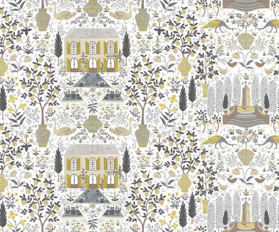 This French farmhouse-inspired print features animals, homes, and fountains in a gray and chartreuse color palette. Consider this the perfect paper for anyone who wants more than plants on their walls.