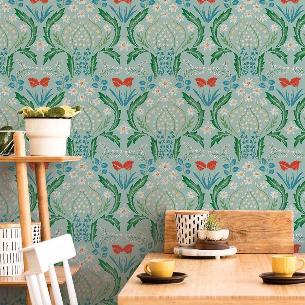 Decor trends like reclaimed wood furniture and ombre coffee table books bring this vintage floral wallpaper into the 21st century. Pair with toned-down pieces to keep things cohesive or go wild with neon accents that contrast the pastel colors.
