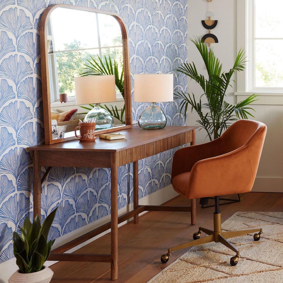 A smaller vanity desk is perfect for storing your books and houseplants as well as for doing your makeup. It has just enough room for a mirror or makeup organizer, and you can even add a floating shelf on the wall right above it. We'd consider this a small apartment must-have.