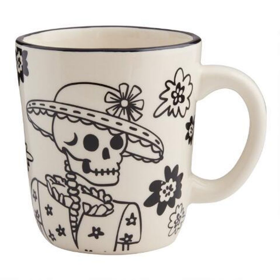 Inspired by the skulls and skeletons — symbols of death and rebirth — that are placed on altars for El DÃa de los Muertos on November 1, this mug features the most elegant skeleton we've ever seen.
