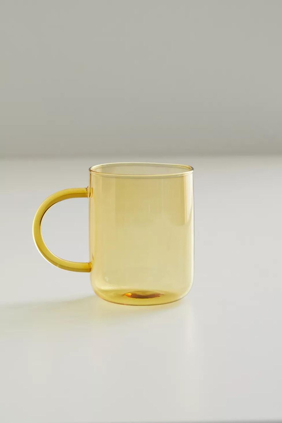 Made from borosilicate glass that's the color of translucent fall leaf, this tinted glass mug is sleek, smooth, and modern.