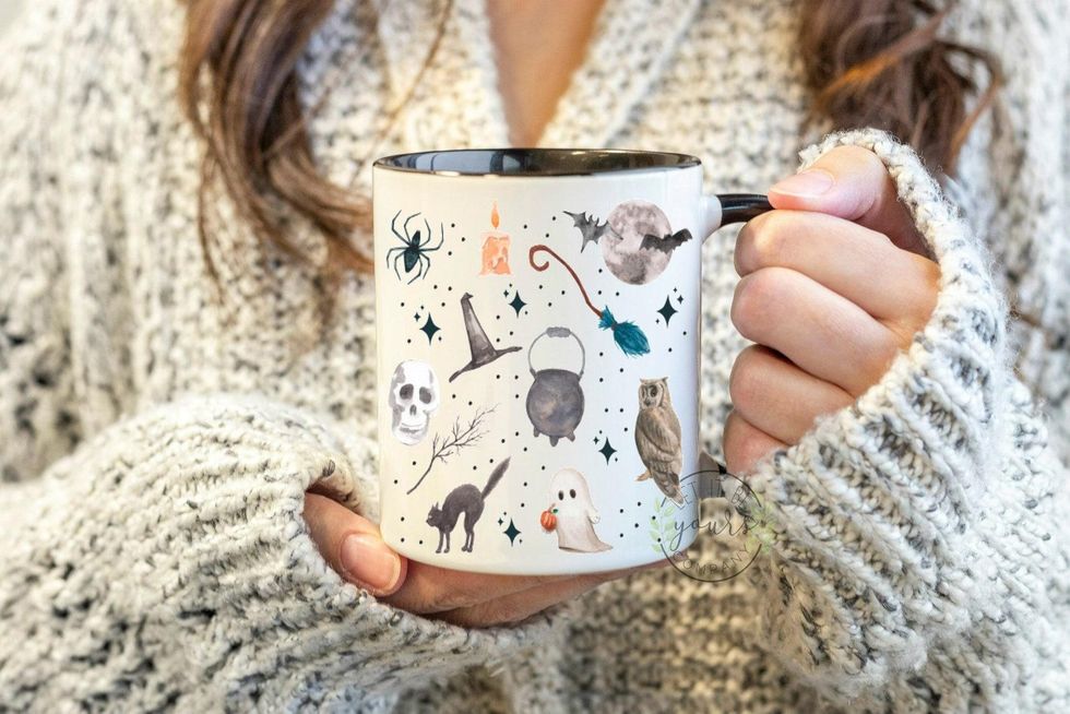 An assortment of iconic fall items — skulls, spiders, cauldrons — dot this handmade mug.