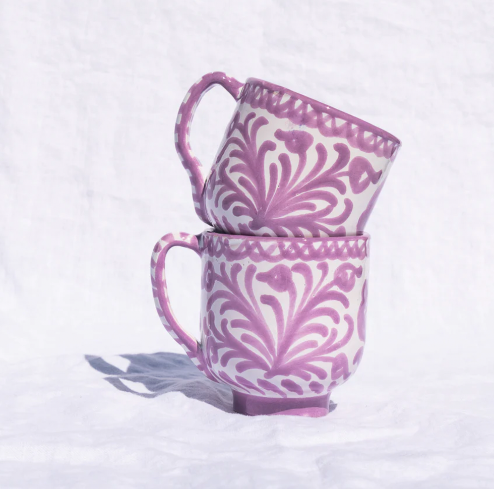 This hand-painted lilac mug features a traditional Spanish Lebrillo design with pomegranates.