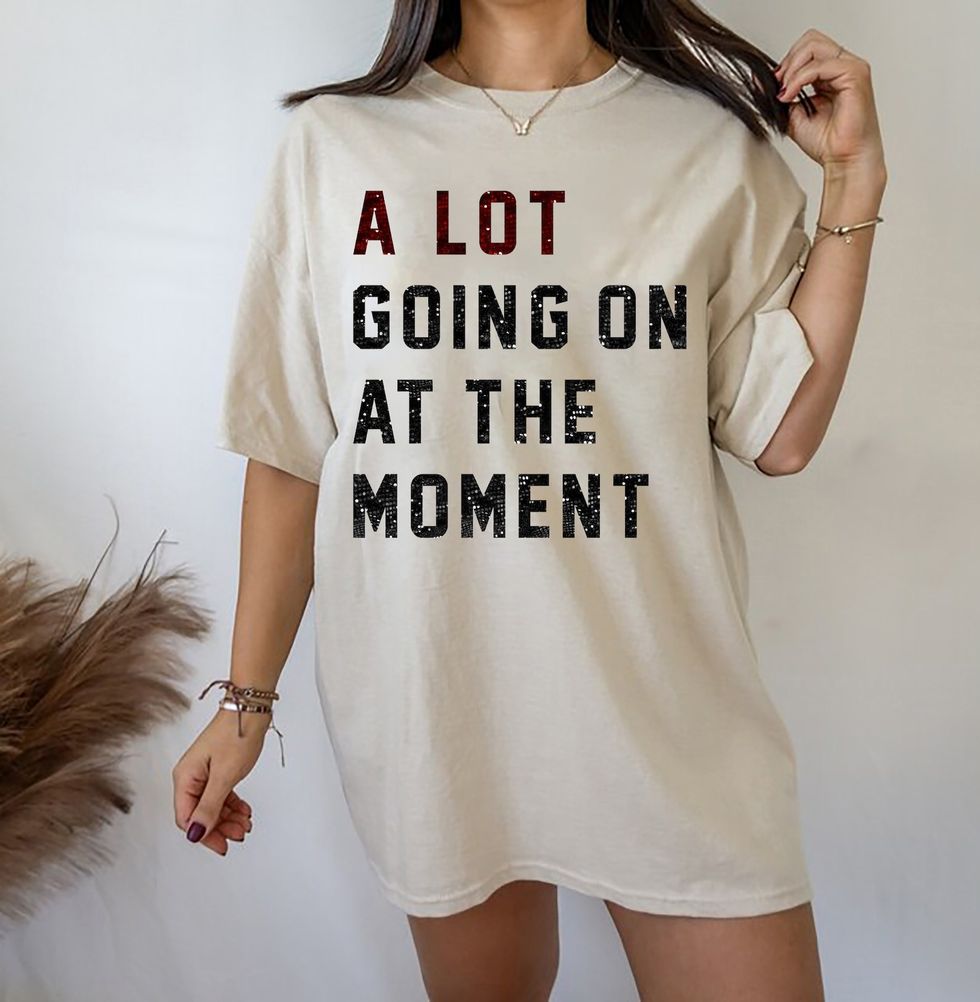 Both Swift and Blake Lively (who directed her "I Bet You Think About Me" music video in 2021) have multiple captions with the same phrase since then, and now it's officially made its way into the Eras Tour. During the concert, (almost) every album get its own segment, and in addition to surprise songs, some nights also feature surprise costumes. One of her shirts during the Red section reads "A Lot Going On At The Moment," playing on both the original tee and the 2020 Instagram post.