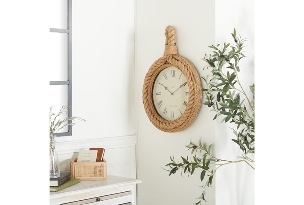 Add rustic charm to your home decor with this wood and rope wall clock that features a circular design. The combination of natural wood and rope materials makes this clock a distinctive piece of decor that complements any style. Hang this clock in your living room, kitchen, or bedroom to keep time in a stylish way that adds plenty of character.