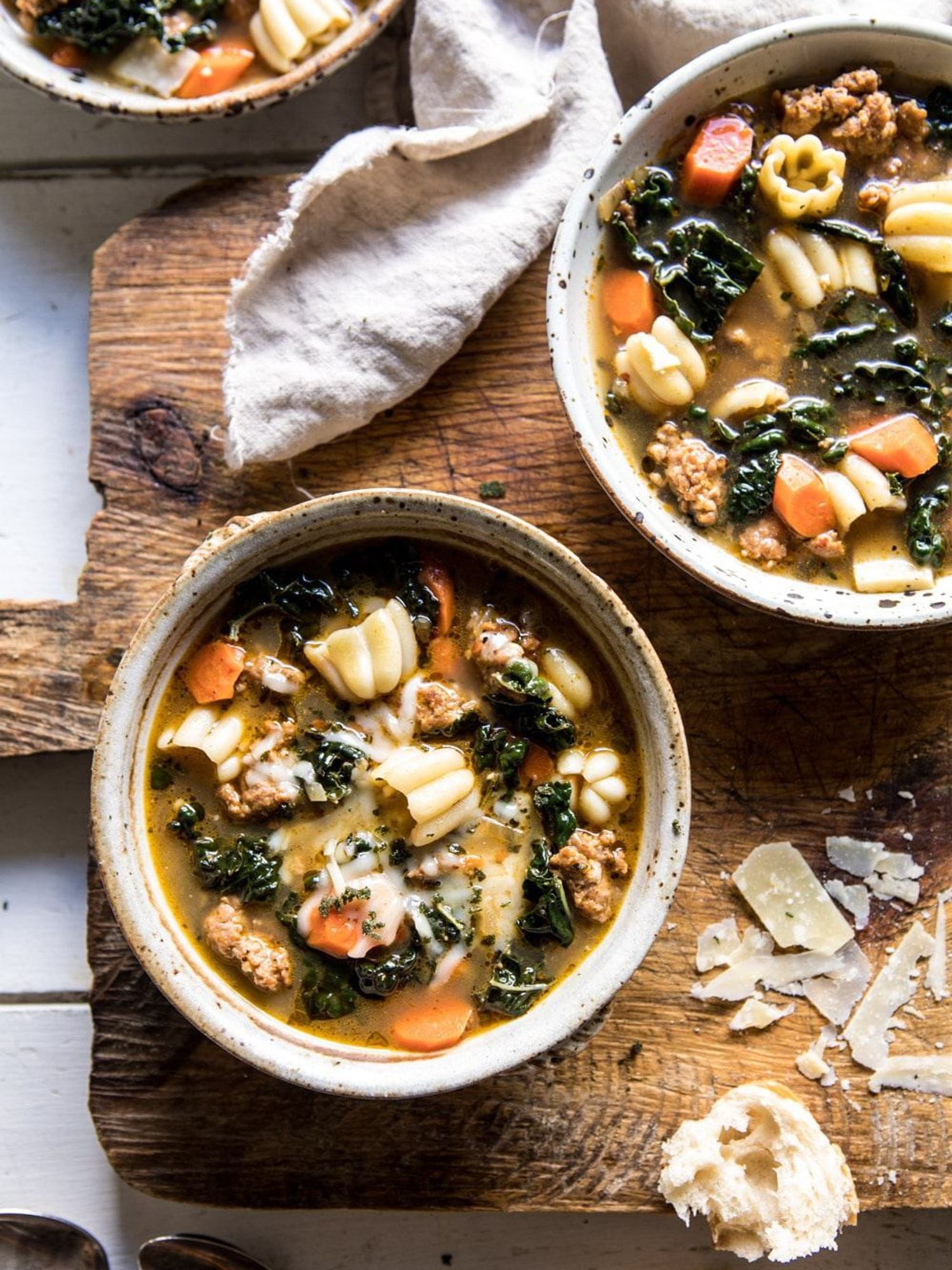 This dish is a different take on a Northeastern Italian soup called Pasta e Fagioli, and it's fairly easy to make. It features a rich combination of Italian sausage, dried oregano, and even vegan Parmesan cheese for a meal that's ready in 20 minutes after popping it in the oven. (via This Wife Cooks)