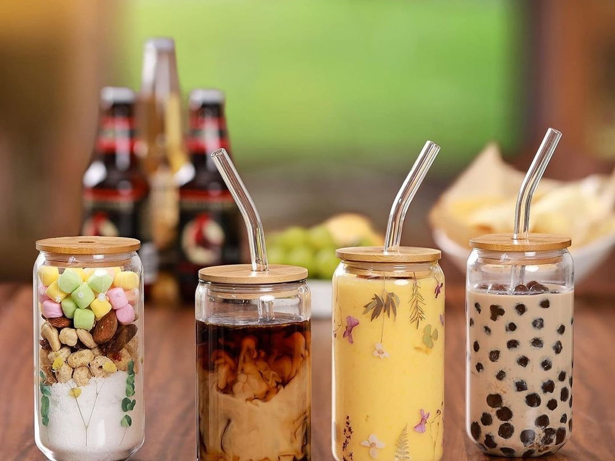 Drinking Glasses with Bamboo Lids and Glass Straw