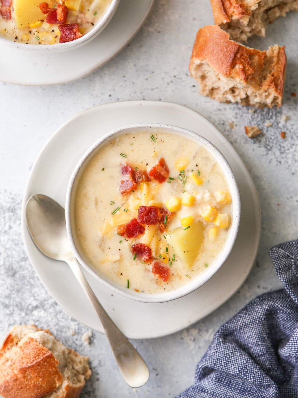 Soups on! Serve up this cheesy and veggie-packed corn chowder, made with gouda, cheddar, or monterey jack cheese, for a cozy lunch at home. (via Completely Delicious)
