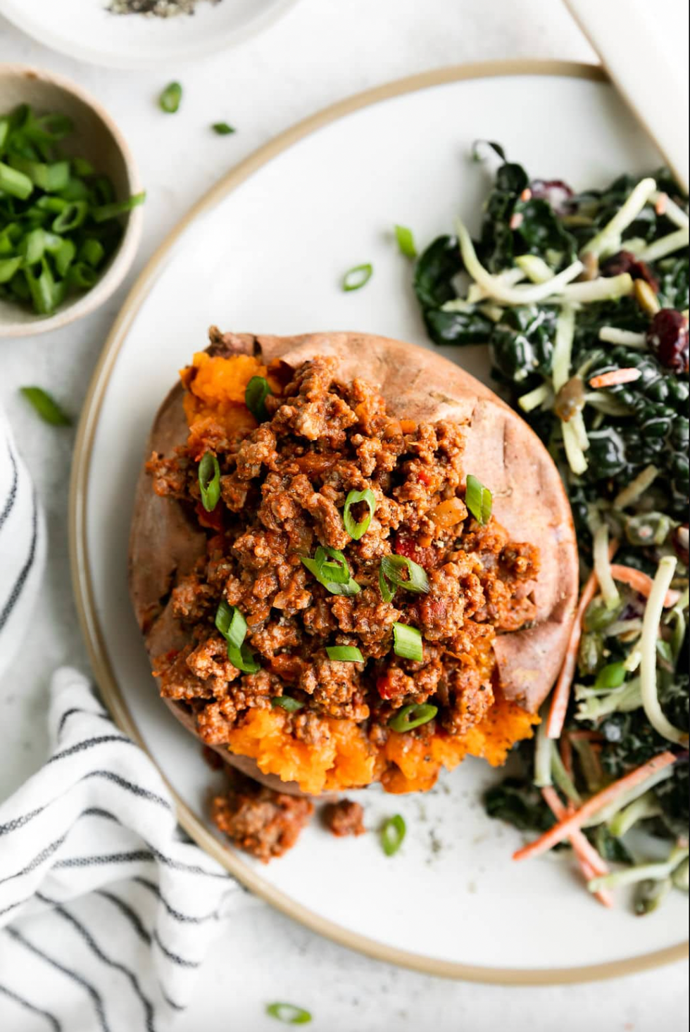 This Healthy Sloppy Joes recipe is a great make-ahead recipe that you can store in the freezer for a quick-to-reheat weeknight meal. Serve it over baked sweet potatoes or sandwich buns for a filling, high-protein recipe. (via Real Food Dietician)