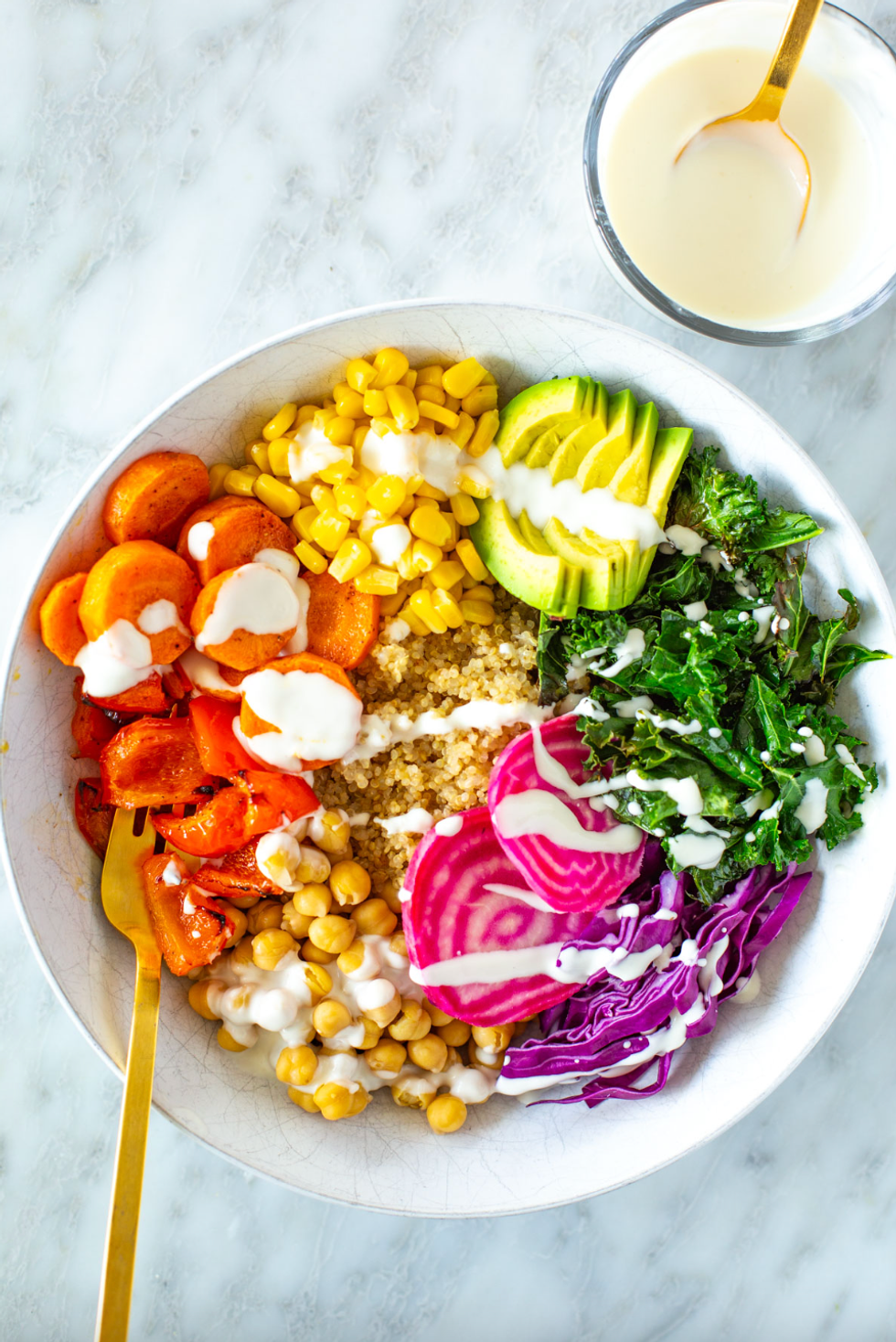How pretty is the bowl? Dig into this easy plant-based meal with quinoa, a rainbow of veggies, and a tasty garlic dressing. (via The Girl on Blor)